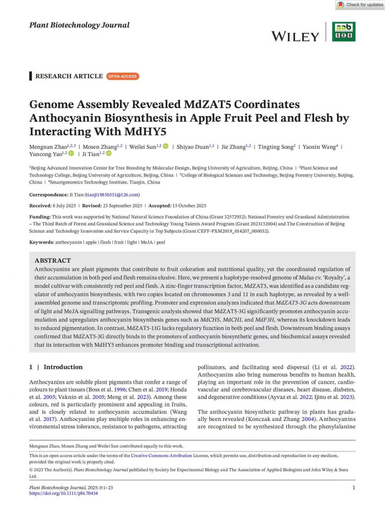 喜讯频传,硕果盈枝!近日,我院田佶教授团队在国际植物生物技术领域顶级期刊Plant Biotechnology Journal上在线发表了题为“Genome Assembly Revealed MdZAT5 Coordinates Anthocyanin Biosynthesis in Apple Fruit Peel and Flesh by Interacting With MdHY5”的研究论文。该研究在苹果果实色泽形成的分子调控机制方面取得了重要进展,为苹果品质改良的分子设计育种提供了关键的理论基础与基因资源。