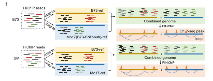 为回答这些问题:不同玉米自交系之间的结构变异(SV)与基因表达水平有何关联?玉米自交系与杂交种的远程三维互作是否存在数量有无及表达水平的异同?玉米杂交种同源染色体之间的互作是否能为杂种优势分子机理解析提供一个潜在洞见?作者以B73、Mo17及其正反交杂交种B73xMo17、Mo17xB73播种后14天幼苗为研究对象,综合采用H3K4me3和H3K27ac介导的HiChIP、Improved 4C-seq、RNA-seq等多组学手段,鉴定了3类互作:亲本(相对于杂交种的)特有互作,杂交种(相对于亲本的)特有互作,杂交种同源染色体之间的互作。在分析策略上,首先生成了一个融合的(combined)B73+ Mo17参考基因组,以尽可能多地捕获亲本或杂交种中能够追溯亲本来源的测序读长(图1)。
