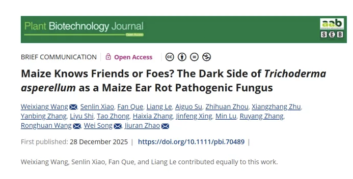 近日,国际知名Top学术期刊Plant Biotechnology Journal在线发表了我院王维香教授团队携手北京市农林科学院赵久然研究员团队的一项重要研究成果——题为“Maize Knows Friends or Foes? The Dark Side ofTrichoderma asperellumas a Maize Ear Rot Pathogenic Fungus”(玉米能辨识敌友吗?棘孢木霉作为玉米穗腐病致病真菌的暗面)的研究论文。该研究首次发现并证实棘孢木霉(T. asperellum)是引发玉米青绿色穗腐病的新型致病真菌,这一突破性发现为生防菌菌剂的应用敲响了警钟,也为全球玉米产业的健康发展提供了关键理论支撑。