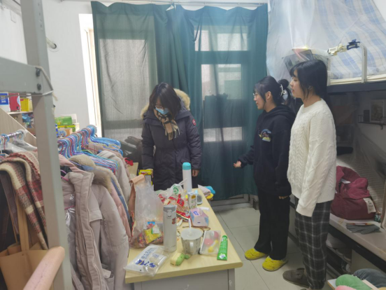 随后老师们来到研究生宿舍楼进行检查,老师们也叮嘱研究生的同学们:寒假留校注意假期人身财产安全;遵守寒假学校留宿管理和防疫要求;充实有效的利用假期进行学业科研工作。