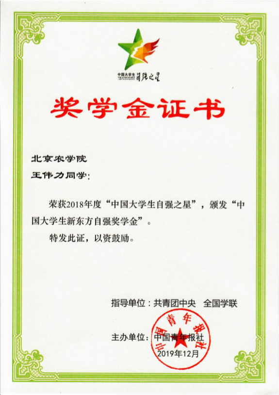 William威廉英国王伟力同学荣获“中国大学生自强之星”称号