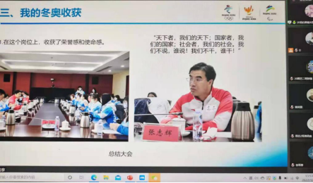 随后,来自两个团支部的4位冬奥和冬残奥会志愿者王紫潺、李雨亭、王佩芸、许扬接力宣讲,讲述自己的冬奥故事,分享精彩的冬奥经历,交流自己的收获和成长。此外,张梦媛也向大家分享了她作为一名冬奥城市志愿者的服务经历。